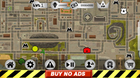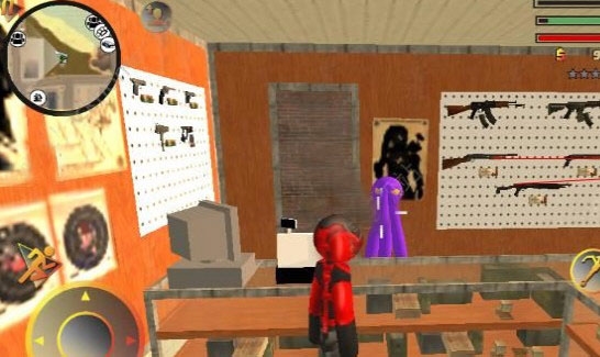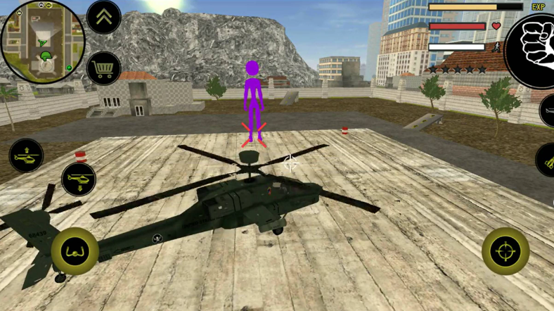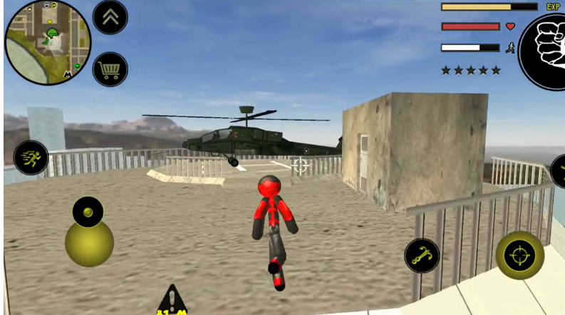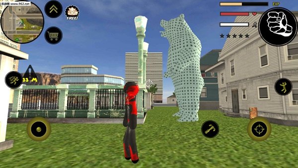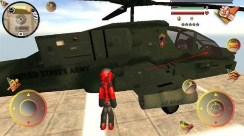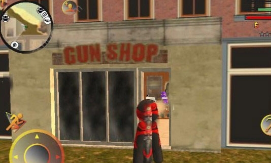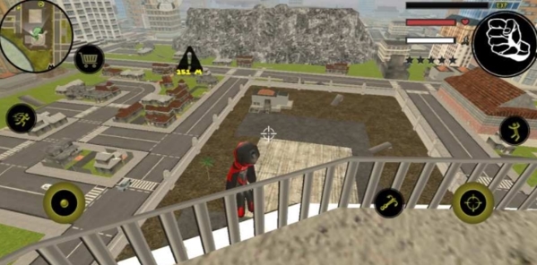 操作方面其实挺简单的,左手控制移动和加速,右手负责发射绳索、攻击、跳跃这些动作。屏幕右上角能清楚地看到你的血量、经验条和当前武器,所有信息一目了然。玩法非常自由,你可以跟城里的其他帮派火并,干掉他们能涨经验。不过闹得太凶会吸引警察的注意,他们和其他人会来找你麻烦。怎么在混战中活下来,并且把对手全部解决,就是你要思考的问题了。