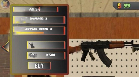 4、现在你就可以浏览所有武器了,用左右两边的箭头来切换。每把武器都会显示它的名字、伤害、射速、弹药和价格。比如说,一把AK74要卖2500块。记住最重要的一点:买了枪之后,一定要再买子弹,不然就是个摆设!