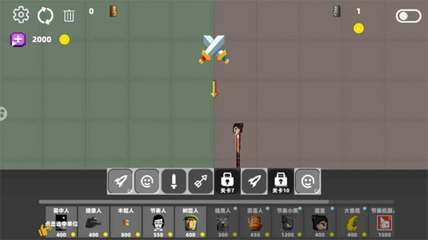 4、底部功能栏点击剑形攻击按钮,为已放置的角色设置攻击指令,准备开启沙盒对战。