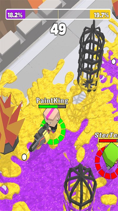 3、持续喷射液体覆盖更多区域,打败敌方行动,争夺场地控制权,扩大优势范围。