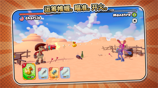 2、使用回合制1v1射击玩法,每一回合都需要考虑角度和时机,玩法轻松但有策略性;