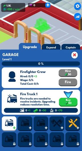 3、进入车库界面,雇佣消防队员,升级消防车,缩短出警处理时间,提升消防事件的解决效率。