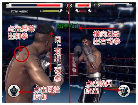 进入比赛后,首先要熟悉屏幕上的信息。最上方那条红色的代表你的生命值,也就是血条,而紧挨着的黄色条则是你的体力值。整个屏幕都可以看作是你的操作区,屏幕左半边控制着角色的左拳,右半边则控制右拳。此外,在屏幕两侧你还能找到用于格挡和闪避的按钮,这些是你进行防守的核心手段。