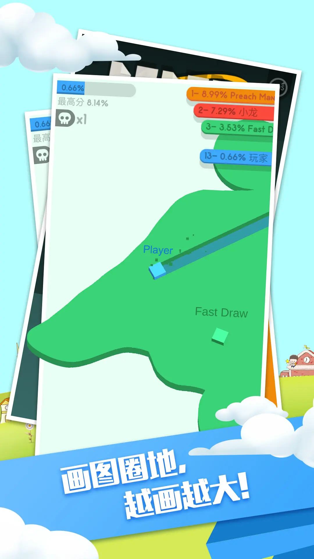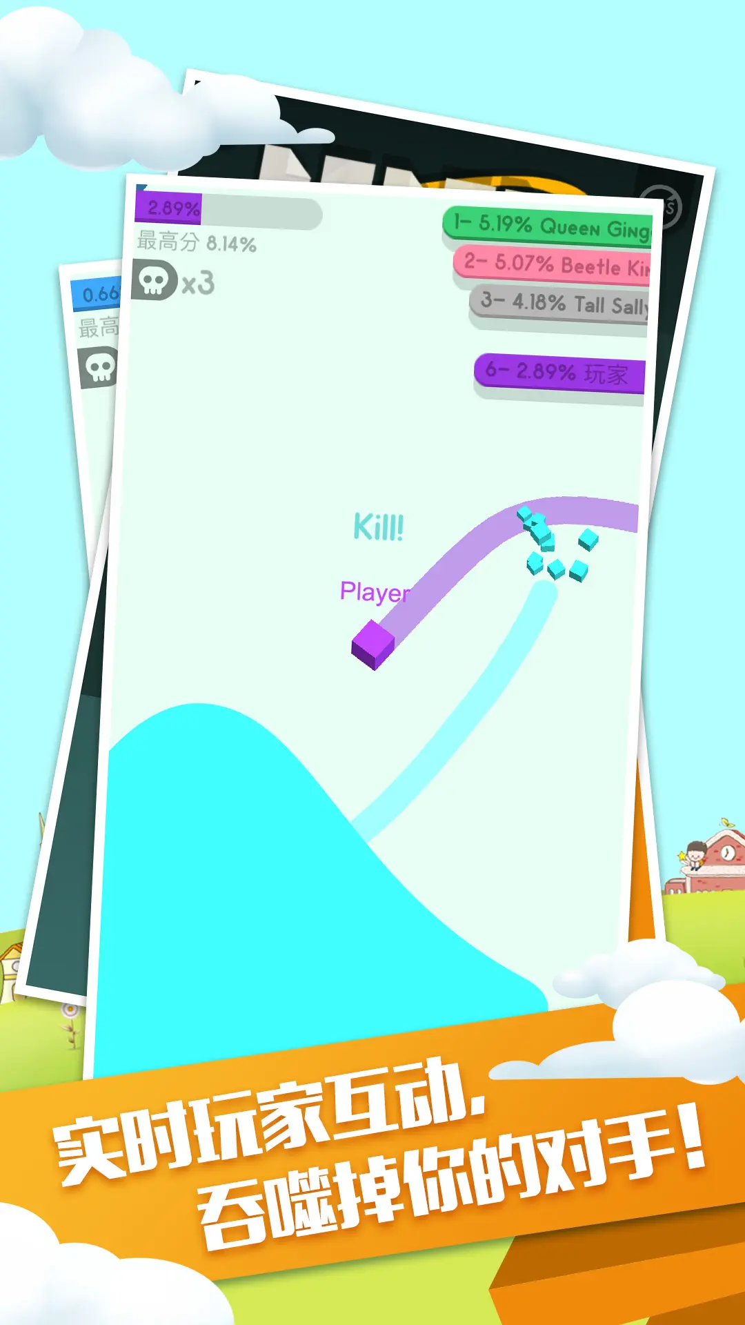 2、操控方块在地图内移动,用自身轨迹占据地图区域,扩大自己的占比面积,提升排名名次。