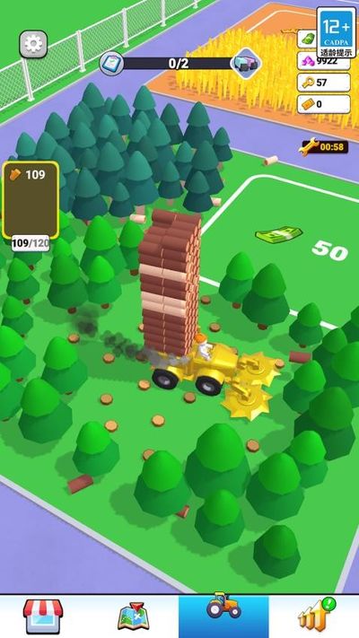 1、驾驶伐木车到树林区域,砍伐树木获取木材资源,同时收集地块上的钥匙,解锁更多区域。