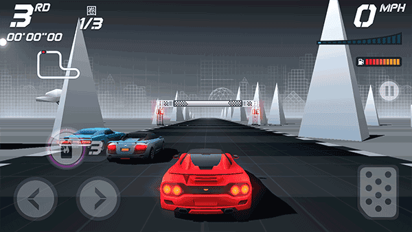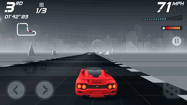 2. 操作控制:操作逻辑简单得不行。屏幕左边点一下就左转,右边点一下就右转。右下角那个大踏板按住了就是油门踩到底,一松手就减速。看下面这张截图,就这几个键,没啥复杂的。