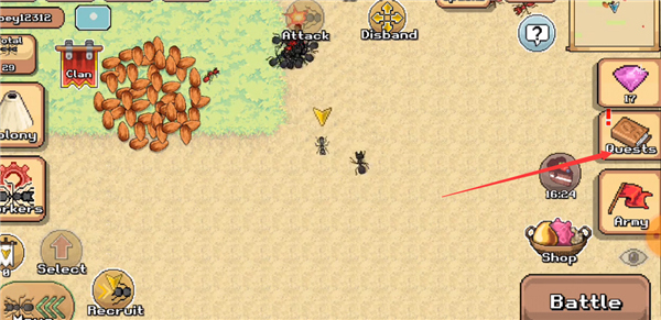8、当需要指挥其他蚂蚁攻击敌人时,先控制你的蚂蚁靠近目标,然后点击下方的“battle”按钮。在这里你也能清楚地看到双方的生命值状况。