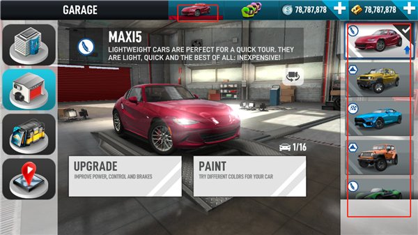 1、游戏下好、一进主界面,先别急着踩油门。看到屏幕上方的那个小汽车图标了吗?点一下,就能进入你的专属车库,右手边一滑,各种酷炫座驾任你挑选。