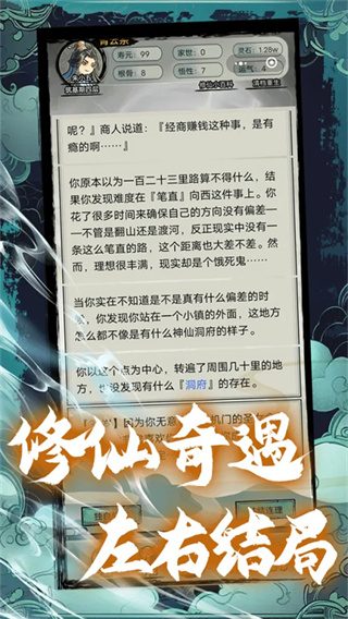1、在修仙开始前需要选择根骨,悟性和家世,气运等,定制会得到怎样的修仙体验;