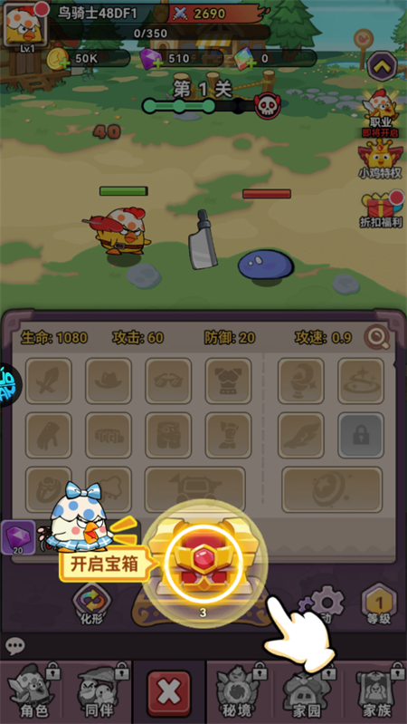 3、游戏玩起来特别省心,你的小鸡会自动进行战斗和闯关,你最主要的操作就是不断开启宝箱,这是让战斗力飞速增长的关键所在。