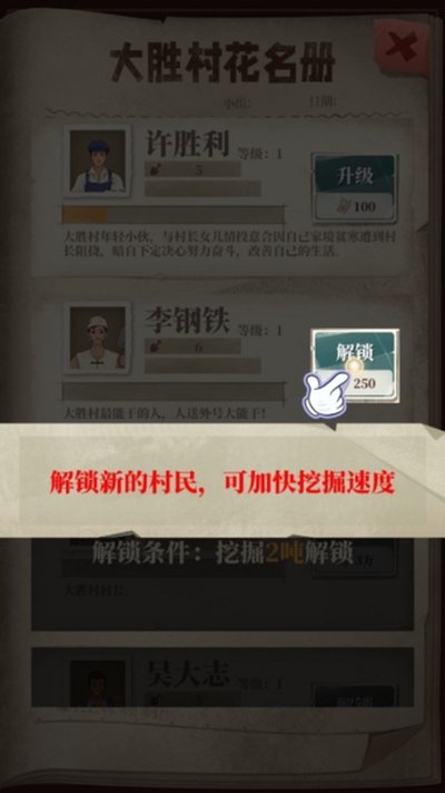 2、人多力量大,这句话在这里体现得淋漓尽致。解锁更多的新村民加入你的队伍,能让挖掘的进度条飞速前进,玩起来有点像经典的“王铲铲”。