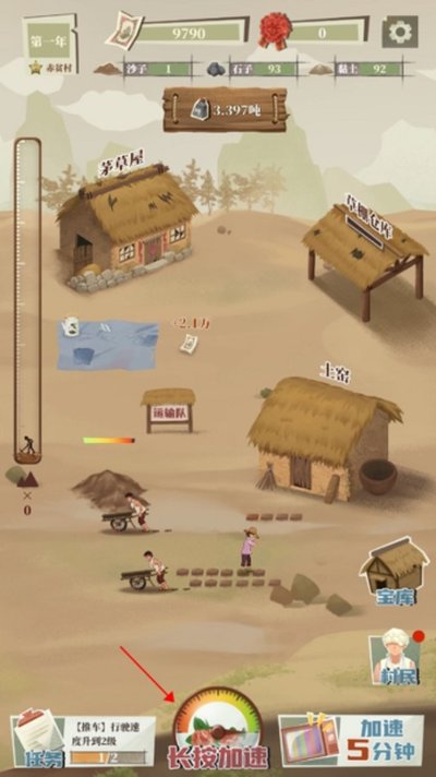 4、这款游戏的核心玩法之一就是放置挂机,就算你暂时离开,挖掘工作也不会停。当然,如果你想更快看到成果,可以随时按住屏幕下方的“长按加速”按钮,体验一把效率拉满的快感。
