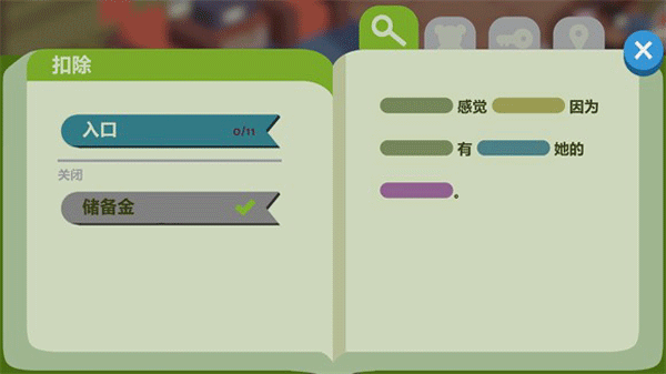5. 游戏里最核心的推理系统就是填空。你需要根据已经掌握的证据,在关键信息的空白处填上正确的词语,从而一步步理清案件的脉络。