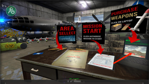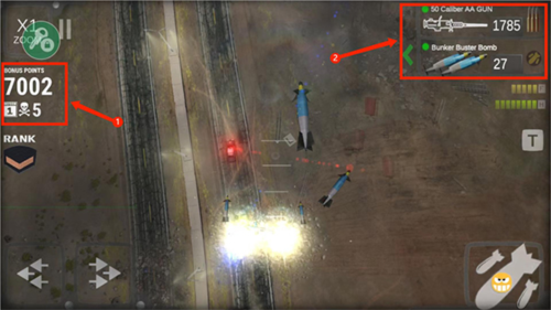7、在界面的左上方,显示的是你当前的得分情况。而右上方则展示了你当前选用的核弹类型以及剩余的数量,你也可以点击这里来切换不同种类的核弹。想要完成任务,你必须将地面上所有的指定目标都彻底清除。