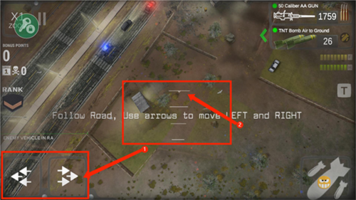 5、现在就正式进入战斗界面了。注意观察屏幕左下角,那里的左右箭头图标分别控制着飞行的左方向和右方向。中间那个【四条杠】的标志就是你的瞄准准星,你需要做的就是把地面的轰炸目标移动到这个准星的中心。