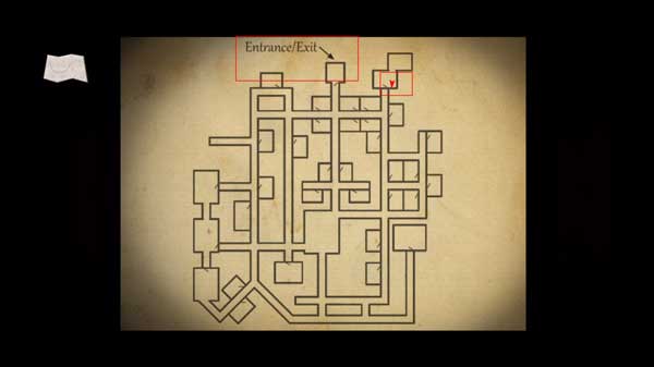 4、要是搞不清方向了,随时可以打开地图查看自己的方位。地图上那个红色的箭头代表的就是你当前所处的位置,而标有“EXIT”字样的地方,就是你最终需要返回的出口。
