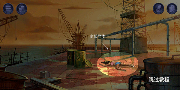 4、好了,现在处理关键证物。把【尸体】拖到刚打开的汽油桶里藏好。