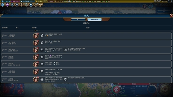 伟人分为大艺术家(包括作家和音乐家)、大商人、大工程师、大预言家、大将军和海军统帅。每个伟人都是独一无二的个体,拥有自己的名字和基于其历史事迹的特殊效果。你可以通过在游戏中积累相应类型的伟人点数来招募他们。伟人一旦使用了他们的特殊效果就会消失,但不会被战斗消灭。
