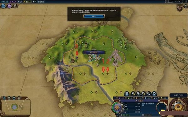 3、以图中为例,1号绿叶图标象征每回合的食物增长量,2号齿轮图标表示工业产出,而3号竖琴图标则对应文化产出。