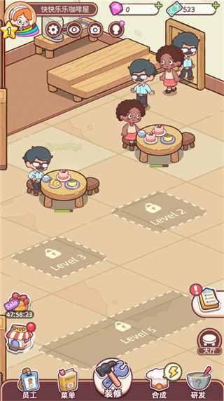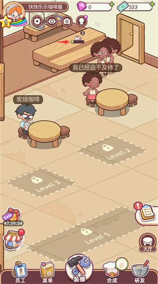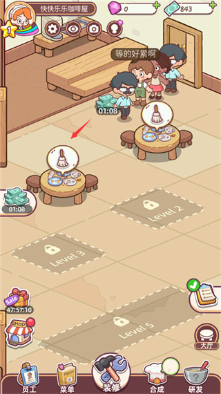 3、不断升级装修咖啡店,地板、桌布、家具、每次使用金币升级不同风格变得更好看,将其装饰成温馨小店;