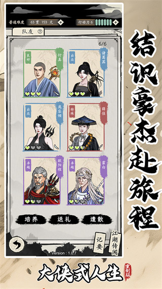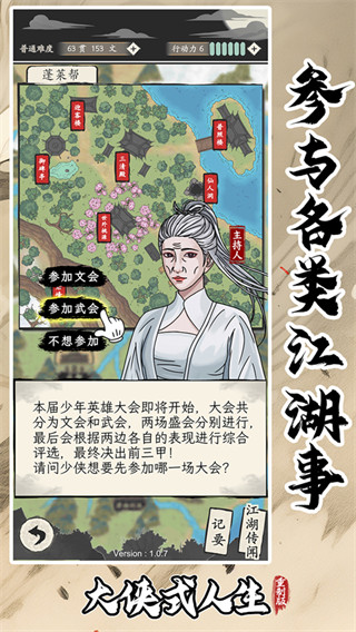 大侠式人生是一款武侠文字模拟人生游戏,需要先选择好自己喜欢的门派和身份,合理的选择好每一个选项来成为一个绝世的武林高手,可以在地图内进行探索去解锁各种剧情故事,建立属于自己的门派来传承给弟子武功,挑战各种不同的门派来提升自己的实力和等级。