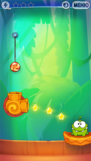 每个关卡的重点就是让小怪物吃到糖果,得到糖果的方法就是切断绳子,然后避开一切会让糖果打碎的陷阱,例如一旁的尖尖的物体,会把糖果打碎,打碎就会游戏结束了,这里还可以利用吹风或者摇动的角度,把糖果送到怪物嘴里,对了,记得要沾到星星,收集到的星星数量可以换取成就和奖励。