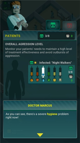 僵尸可以说是最难应付、也最危险的一类病人了。如果你的医生没能给予他们周到的照料,他们就很可能陷入狂暴状态,并攻击医护人员。一旦发生这种情况,整个医院都有可能面临感染扩散的风险。因此,你必须时刻留意病人的情绪变化,为他们提供充足的娱乐活动,并不断提升病房的舒适度,这些都非常关键。
