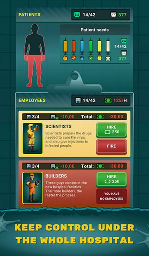 想要高效地治愈患者,你就必须招募一支合格的专业团队!你需要根据自己的发展蓝图,来决定雇佣或解雇哪些领域的专家,并为他们配置最顶尖的医疗器械。无论是护理人员、科学家、心理治疗师,还是建筑工和清洁工,每一种岗位都不可或缺。团队里的每一个人,都在这场对抗感染的艰巨事业中承担着重要的职责。