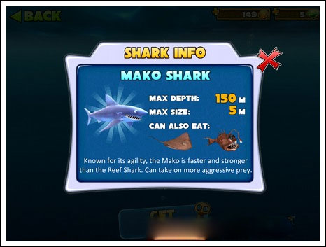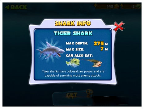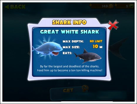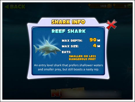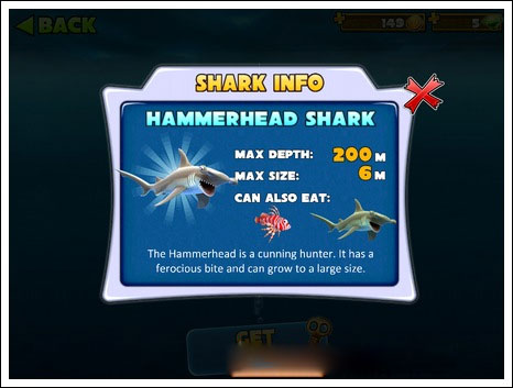 5、随着游戏进程,你将逐步解锁更多水下世界的凶猛巨兽:包括灰鲭鲨、锤头鲨、虎鲨以及所向无敌的史前巨兽大白鲨!