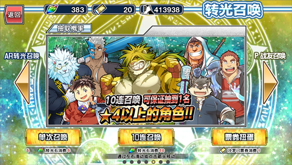 游戏里绝大部分的角色,都需要通过“转光召唤”这个抽卡系统来获得,只有极少数的角色可以通过参与活动免费拿到。抽卡池分为好几种,比如常驻的转光召唤、限时的期间限定召唤、抽装备的AR转光召唤以及用友情点抽的战友召唤。进行召唤需要消耗一种叫做“转光石”的道具,或者是“沙罗门票券”。
