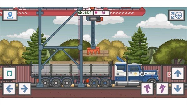 3、成功夹取货物之后,就可以开着叉车回到你的大卡车旁边了。将叉车上的货物对准车厢位置,再次按下左下角的绿色夹子按钮,货物就会被平稳地放置在卡车上。