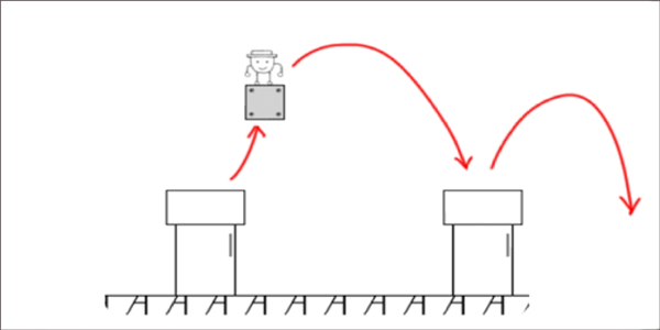 2、行至此处,需提防那个圆形小人,并留意他所说的台词:“You jump I jump”。所以,当你在跳下去的一瞬间,必须马上顶出那个绿色的机关平台,否则那个小人就会跟着你一起跳下去,导致游戏失败。