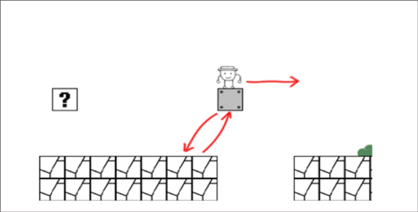 2、在这个位置向上跳一下,第一个机关平台就会出现。你可以直接跳到那个带问号的砖块上,然后在砖块的边缘位置再次起跳,引出第二个机关平台。跳到这个机关上再向右跳,但这个时候一定要控制好跳跃的距离,因为游戏里所有的云朵都是致命的障碍物。