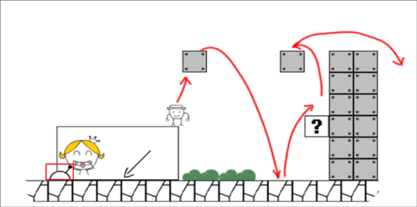 3、甩开那个小人之后,还不能直接跑向公主,那样你会掉进一个大坑里。你需要先把所有绿色的机关平台都顶出来,然后从最上方的平台跳下去迎接公主。降落的时候要小心,别把公主给砸到了。