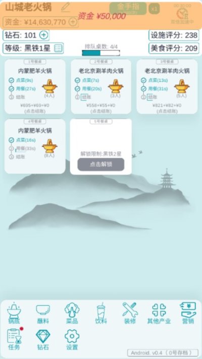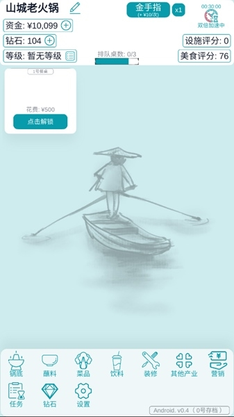 经营火锅店无限钻石金币版是一款非常好玩的模拟经营游戏,在这里我们需要经营一家火锅店,因此我们的目的就是发展我们的火锅店,然后赚更多的钱,让自己可以成为火锅之王。另外经营火锅店游戏虽然是开店游戏,但是玩法十分的简单,因为它不需要我们去准备各种食材,来招待客人,我们只需要准备好餐位即可,客人们会自动去烹饪美食,因此我们的火锅店可能是主打的就是百分百自助的火锅店吧。唯一的缺点就是这款游戏没有任何的新手指引,因此很多玩家在初入游戏之后,不知道自己该干些什么,所以这里小编建议大家可以看看任务列表,根据任务列表刷下来,基本上,也就是掌握了游戏的基础玩法了,此外小编这里提供的版本也是经过大神修改的版本,因此你在游戏中可以获得无限的金币,因此感兴趣的玩家,快来看看吧!