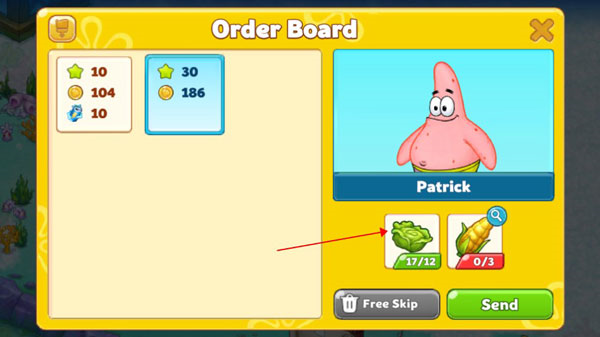 5、这时,你可以点击屏幕上的订单栏,查看一下当前的任务。比如,你会看到派大星的订单里需要一些新鲜的生菜。