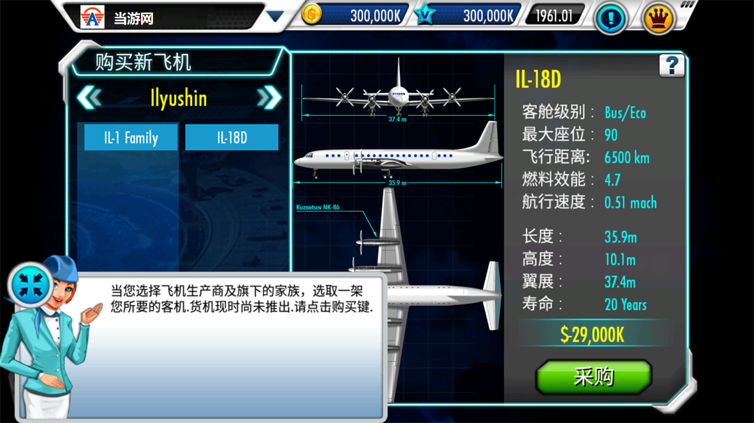 7、万事俱备,只欠飞机。你的第一项任务就是去飞机市场,为你的公司购入第一架客机。