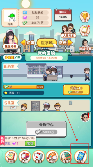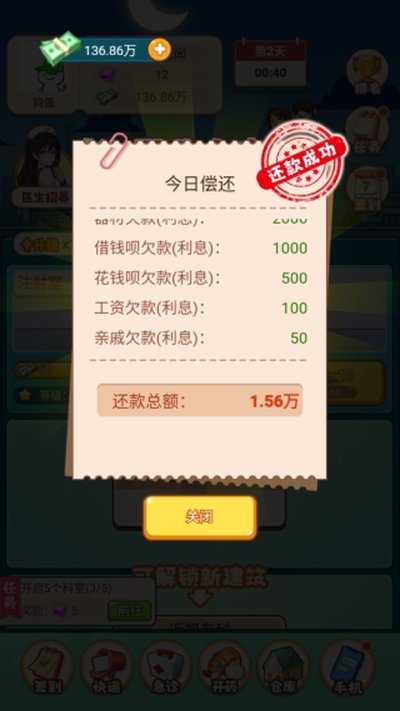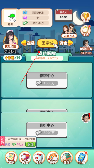 3、当你的资金积累到一定程度时,别忘了用它来投资。你可以选择升级现有的诊室,或者解锁全新的科室来扩大医院规模。