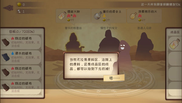 3、炼好之后,直接把成品拖给对应的顾客,这单生意就算完成了,钱也到手了。另外,不管是原料区的材料,法阵上的,还是成品,只要不想要,都可以直接拖到屏幕最下面扔掉。还有,顾客的耐心是有限的,而且每个人都有自己的特性,想看具体信息就长按那个顾客。