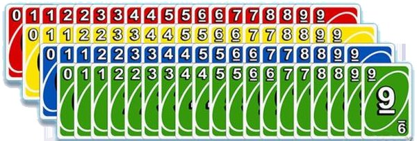 数字牌的数字从0到9,每种颜色都包含1张数字0的牌和2张从1到9的牌。