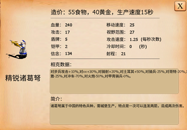中国:中国的诸葛弩可以说是克制条顿的核心力量,它极高的攻击频率可以快速削减条顿武士的生命值。同时,中国的火炮也能在安全距离外摧毁条顿的攻城武器。