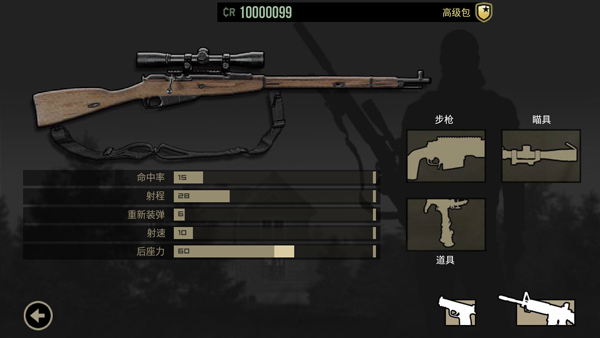 4、点击“步枪”选项,你可以在这里选择要使用的武器,并且可以为它装备不同的瞄具或者携带辅助道具。