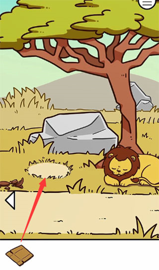 3、这一关你得去第二个场景把那个罐子敲碎,能拿到一个纸箱。然后回到第一个场景,把纸箱子放在那个圆形的空地上。看到截图里那个狮子没,它会傻乎乎地钻进箱子里,把屁股底下藏的食物露出来。过去拿了吃了就完事。