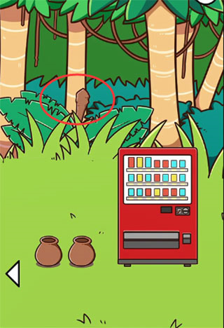 2、先去第三个场景的草堆里翻出根木棒,用这棒子去敲树干就能搞到椰子。第二个场景和第一个场景分别有俩椰子。这关有两种过法:第一种是直接敲第二个场景的树,拿到能吃的那个椰子啃了就行。第二种是去敲第一个场景的椰子,会掉个硬币,拿着硬币去自动售货机买吃的。