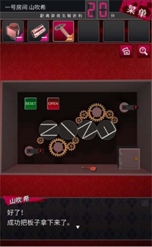 到一块板子前面,把齿轮和纱布都装上,转动两边的力臂,把字母调成“NINE”,然后点“OPEN”,钥匙到手。