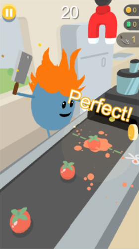 屏幕上飞过来一堆水果蛋糕啥的,划屏幕切它们榨汁。注意看,别手滑把电器给切了。