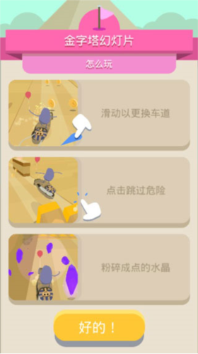 左右滑动换道,点一下屏幕是跳跃,躲开障碍物,然后把路上的水晶撞碎得分。