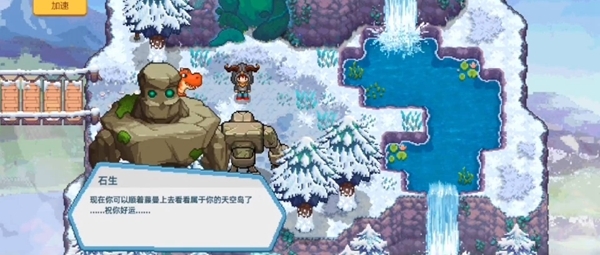 2、当你爬到藤蔓顶部后,会遇到一个叫咕咕灵的生物,和它交谈后,它就会引导你完成解锁天空岛的后续步骤。