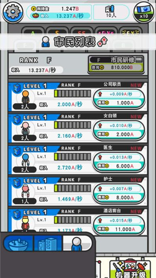 除此之外,你也可以通过【升级机器】或者对市民进行【市民研修】,这两种方法同样能有效地增加你的金币收入哦。