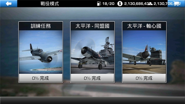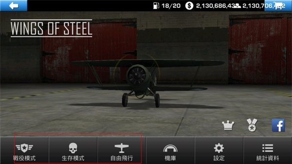 1、打开游戏后,主界面上会显示三种主要的玩法模式,分别是战役模式、生存模式和自由飞行。旁边的“机库”按钮可以让你进去更换和检视你的飞机。